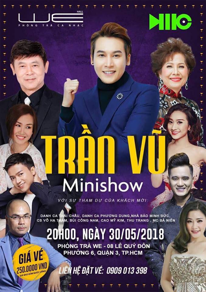 Minishow Trần Vũ sẽ diễn ra vào tối 30/5 tại phòng trà WE, TP.HCM. Dàn khách mời góp mặt là những người tiền bối, đồng nghiệp thân thiết với Trần Vũ: danh ca Thái Châu - Phương Dung, quán quân "Hãy nghe tôi hát" Võ Hạ Trâm, Bùi Công Nam, Cao Mỹ Kim, Thu Trang, nhà báo Minh Đức và MC Bá Niên.