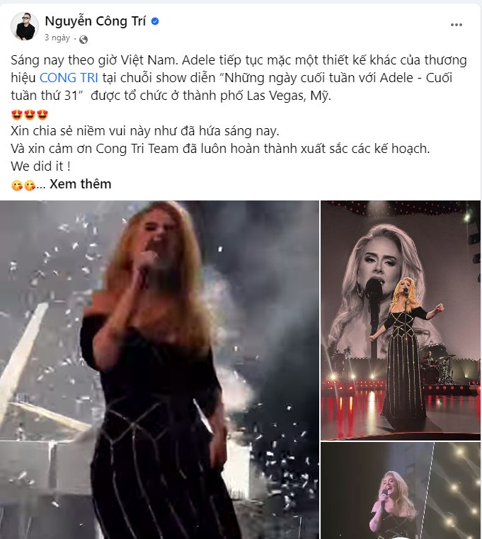 Sáng 15.10 (giờ Việt Nam), Adele đăng tải loạt khoảnh khắc hậu trường trong show diễn mới nhất thuộc chuỗi âm nhạc “Weekends with Adele”. Nữ ca sĩ ây ấn tượng với chiếc váy đen sang trọng, quyến rũ. Đáng chú ý hơn, người hâm mộ Việt nhanh chóng nhận ra chủ nhân của thiết kế này là NTK Công Trí trong bài đăng trên trang cá nhân gần 3 triệu lượt yêu thích.