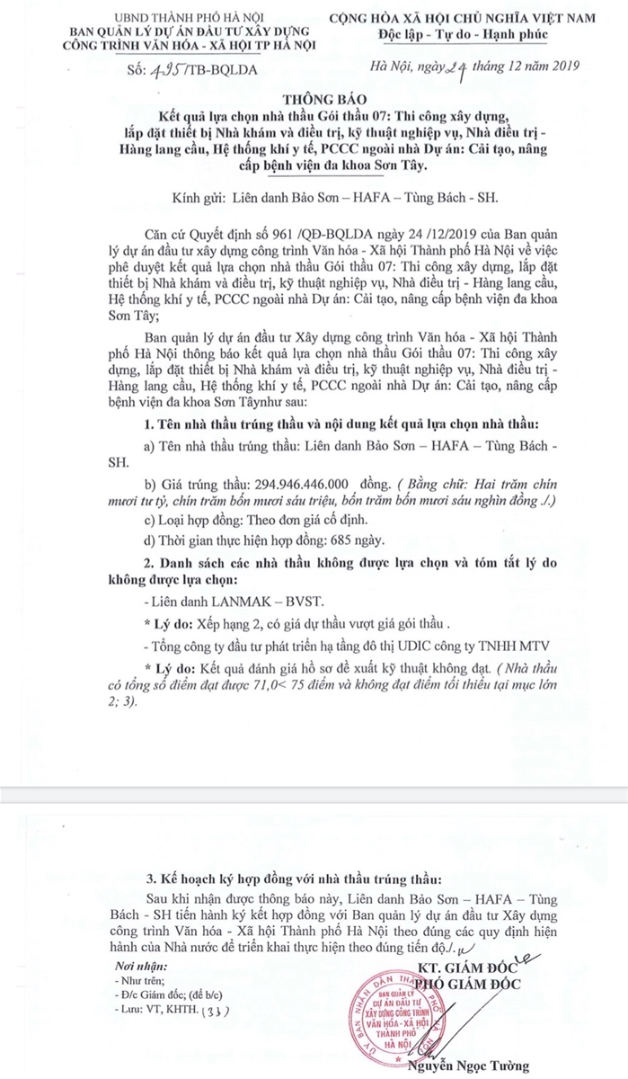 Ngày 24/12/2019, ông Nguyễn Ngọc Tường - Phó Giám đốc Ban QLDA Văn hóa - Xã hội TP Hà Nội ký QĐ số 961/QĐ-BQLDA lựa chọn liên danh 3 nhà thầu gồm: Cty TNHH đầu tư phát triển Tùng Bách, Cty CP xây dựng kỹ thuật SH Việt Nam, Cty TNHH xây dựng Bảo Sơn, Cty CP xây dựng và kỹ thuật HAFA trúng gói thầu số 07 (thi công xây dựng, lắp đặt thiết bị Nhà khám và điều trị, kỹ thuật nghiệp vụ; Nhà điều trị - Hành lang cầu; Hệ thống khí y tế, PCCC ngoài nhà của dự án đầu tư cải tạo, nâng cấp Bệnh viện Đa khoa Sơn Tây) với giá trúng thầu là 294.946.446.000 đồng.