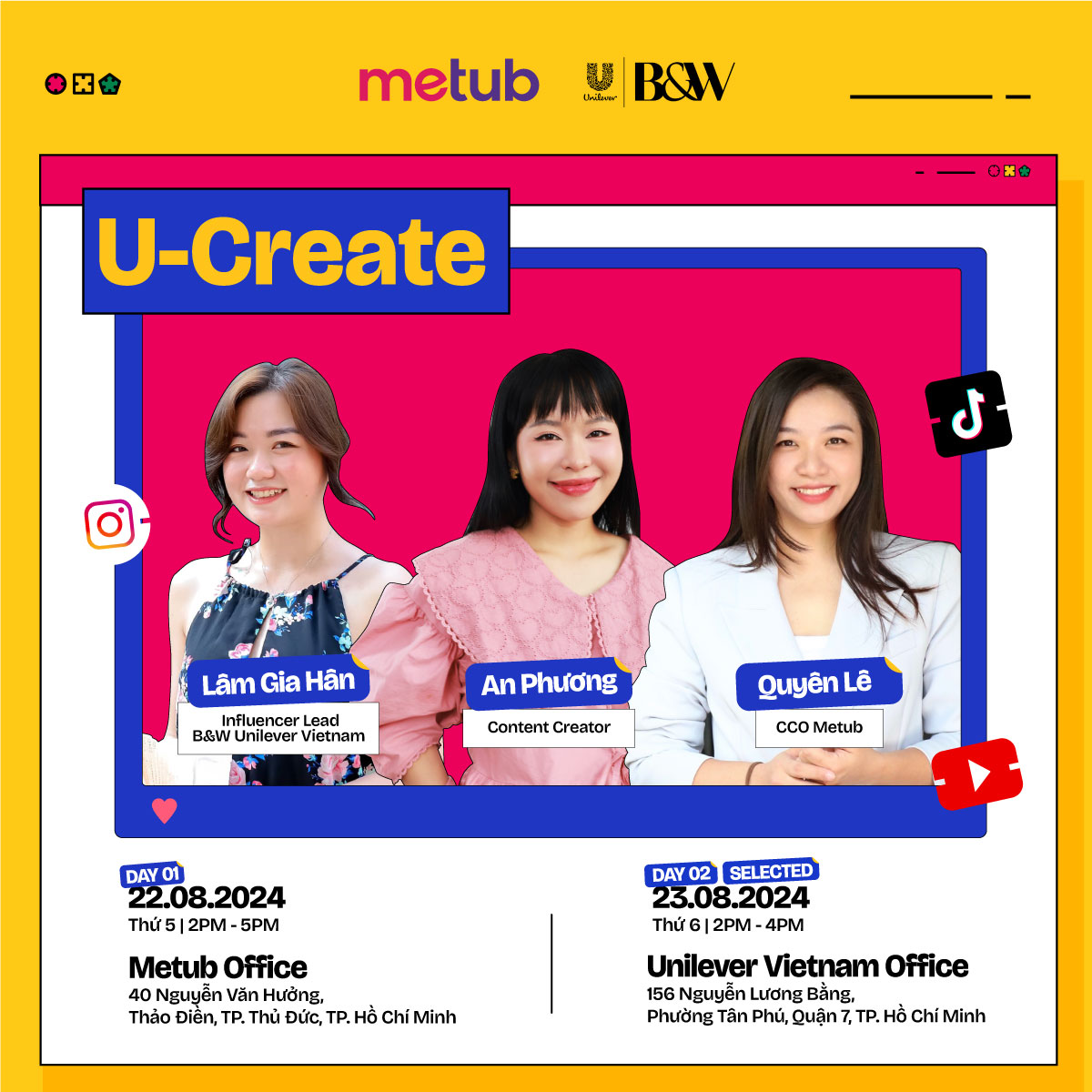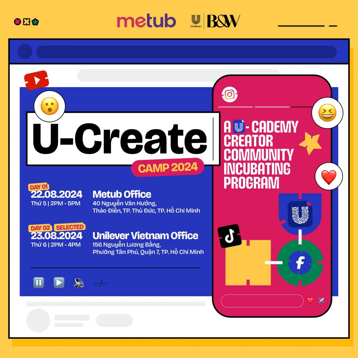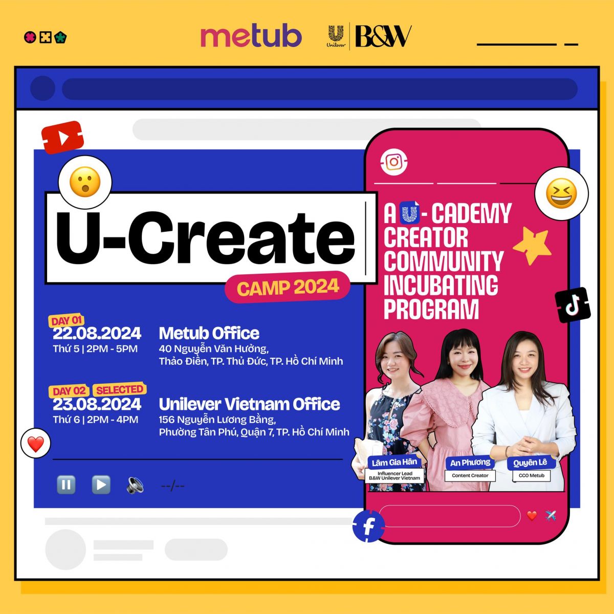U-CADEMY - một chương trình “ươm mầm" cộng đồng sáng tạo nội dung thế hệ mới do B&W Unilever Việt Nam cùng Metub hợp tác tổ chức chính thức khởi động trong tháng 8/2024, mang đến chuỗi hoạt động định hướng các nhà sáng tạo nội dung thế hệ mới hợp tác chuyên nghiệp cùng nhãn hàng, và mở đầu với sự kiện U-Create Camp. Đúng như tên gọi “U-Create"- “Bạn tạo nên”, mỗi nhà sáng tạo nội dung là nhân tố chính trong việc định hình ngành công nghiệp này, từ việc tạo nội dung, tạo thảo luận, trải nghiệm đến việc tạo ra thu nhập,... nếu thực sự hiểu rõ thị trường.