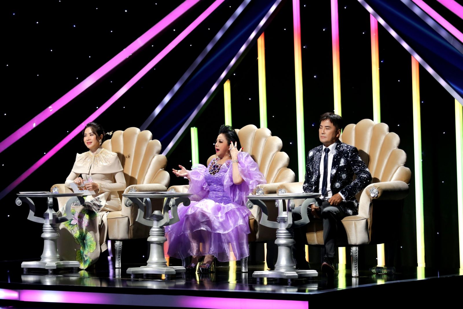 Trong đêm thi chủ đề Trở lại 90, khán giả sẽ được hội ngộ ca sĩ Chế Thanh trên ghế nóng của Tỏa Sáng Sao Đôi 2023. Xuất hiện ở vị trí giám khảo, Chế Thanh trông vô cùng phong độ và trẻ trung với trang phục vest cách tân. Anh chọn tông màu trắng đen đối lập với họa tiết mặt trăng – mặt trời làm điểm nhấn.