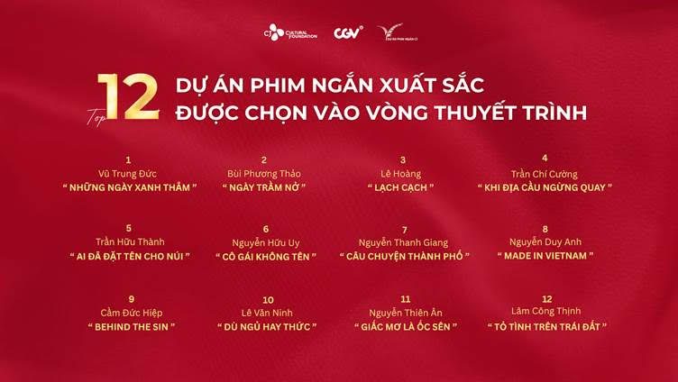 (ĐSVH) Sau gần hai tháng phát động, Dự án phim ngắn CJ 2025 đã chọn ra 12 ý tưởng nổi bật bước vào vòng thuyết trình diễn ra ngày 6/8 tới tại CGV Vạn Hạnh Mall (TP.HCM). Sự kiện năm nay thu hút hơn 400 hồ sơ đăng ký, phản ánh sức hút của sân chơi điện ảnh dành cho các đạo diễn trẻ.