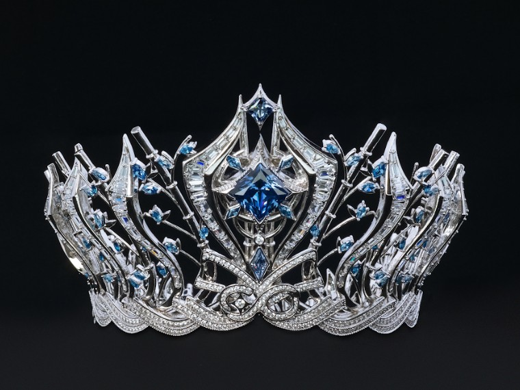 “TRE’15 THE CROWN” và “TRE’15 THE TIARA” được bọc bạch kim Platinum nguyên chất óng ánh, đính 3 viên Blue Shapphire Princess tại vị trí trung tâm tổng cộng 130.4ct. Ngoài ra, vương miện còn đính 100 viên Blue Sapphire Marquise và 744 viên White Zirconia với nhiều kích thước khác nhau, sáng lấp lánh bao phủ toàn vương miện. Tuyệt tác dành cho Top 2 đã được sản xuất trong 1960 giờ liên tục sáng tạo của đội ngũ nghệ nhân Kim Cương Ngọc Châu Âu.