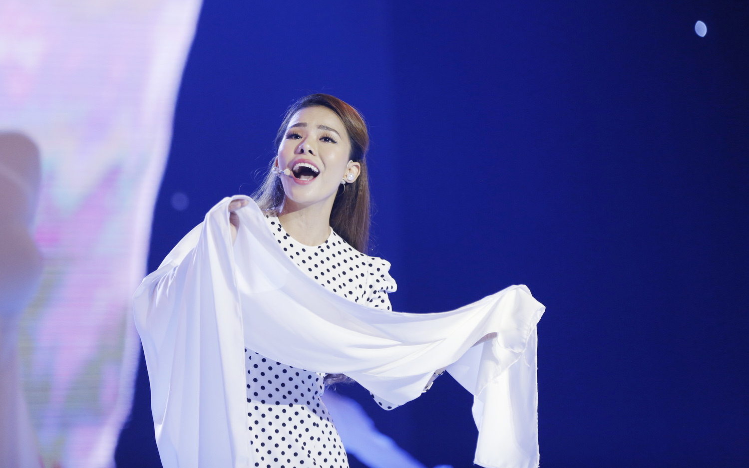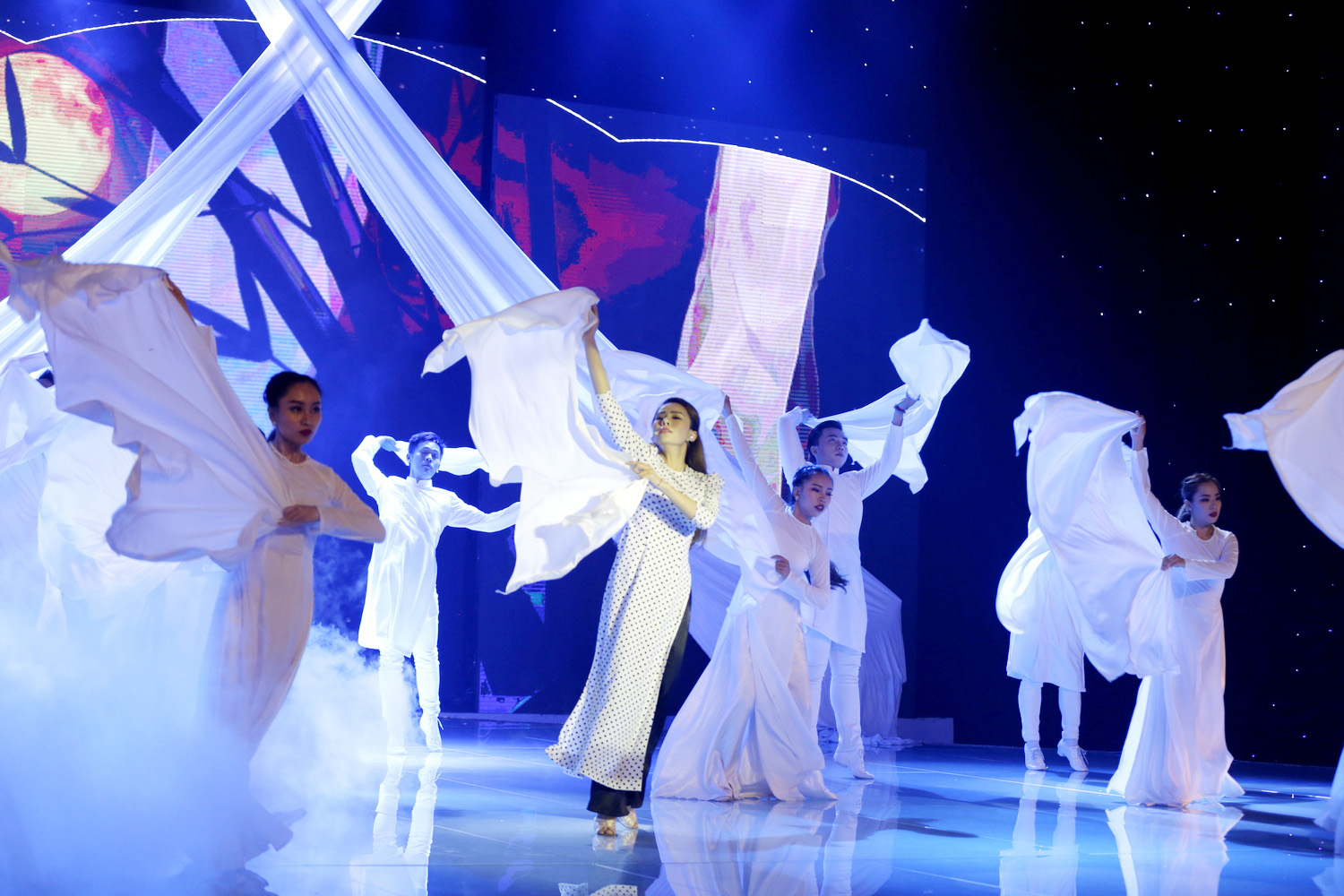 Chị chọn chất liệu lụa cho toàn bộ tiết mục từ trang phục áo dài cho đến chiếc khăn múa để ước lệ tấm lụa như chính người phụ nữ, mềm mại và uyển chuyển.