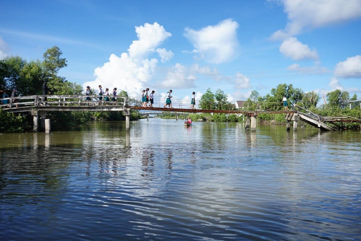 Đường đến trường tiềm ẩn hiểm nguy của các em học sinh trường tiểu học Tân Duyệt, Cà Mau được ghi lại trong chương trình Kiến Tạo Nhịp Cầu