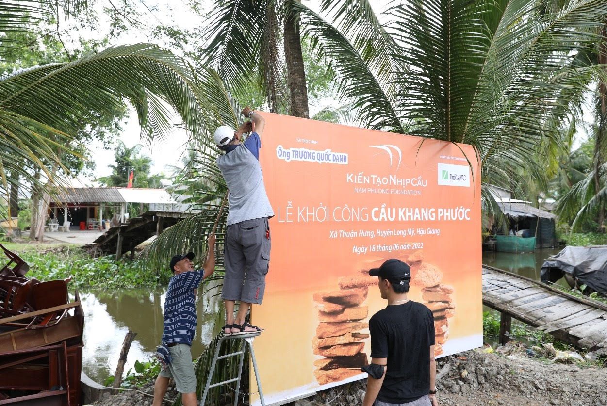 Nhân viên DatVietVAC chuẩn bị cho sự kiện khởi công cầu Khang Phước, Hậu Giang của Quỹ Nam Phương ngày 18/06