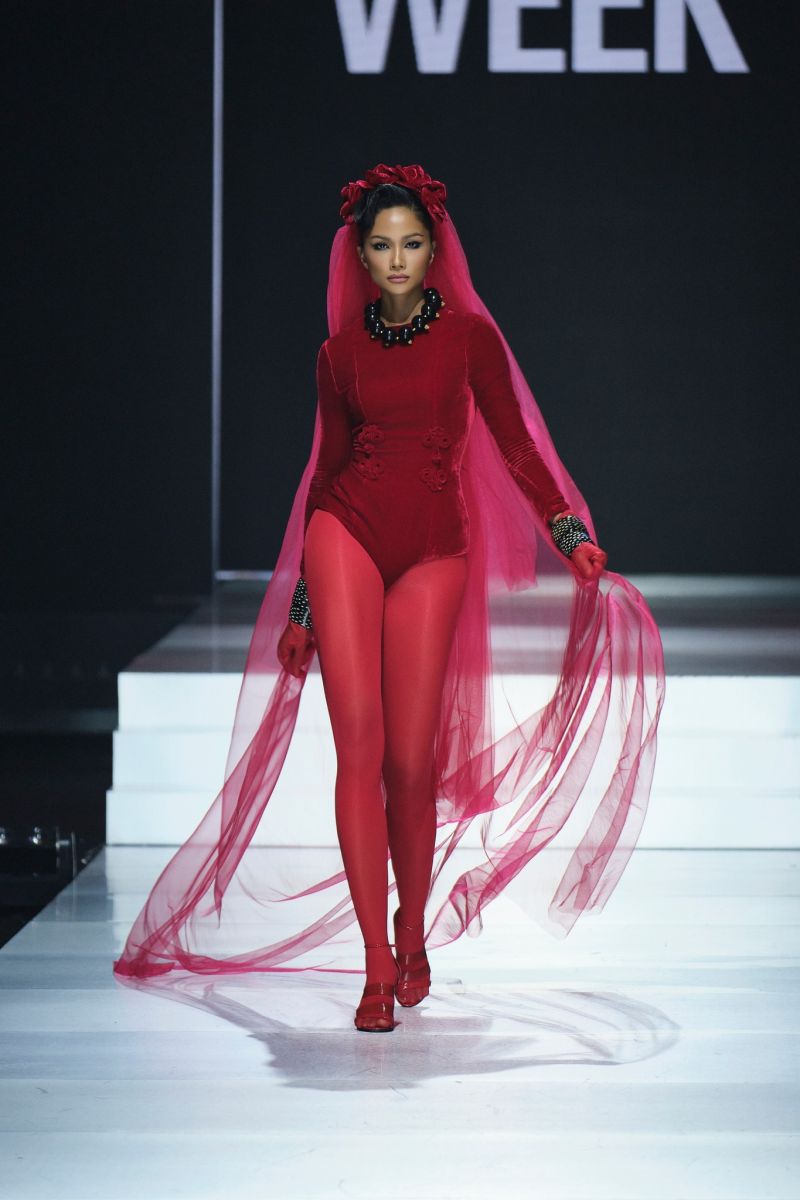 Trong đêm bế mạc tuần lễ thời trang, H’Hen Niê chọn cách trình diễn vừa phải cho BST “Khải Hoàn” của NTK Hà Linh Thư, nhịp đi không nhanh như ngày đầu hay thướt tha như ngày thứ 03. Với bộ trang phục điểm nhấn là khăn voan dài nhẹ nhàng tạo cảm giác bay bổng điểm xuyết những đoá hồng đỏ rực, H’Hen Niê thể hiện sự nữ tính trong từng bước đi, khéo khoe vóc dáng lý tưởng từ kết quả tập luyện chăm chỉ của mình.