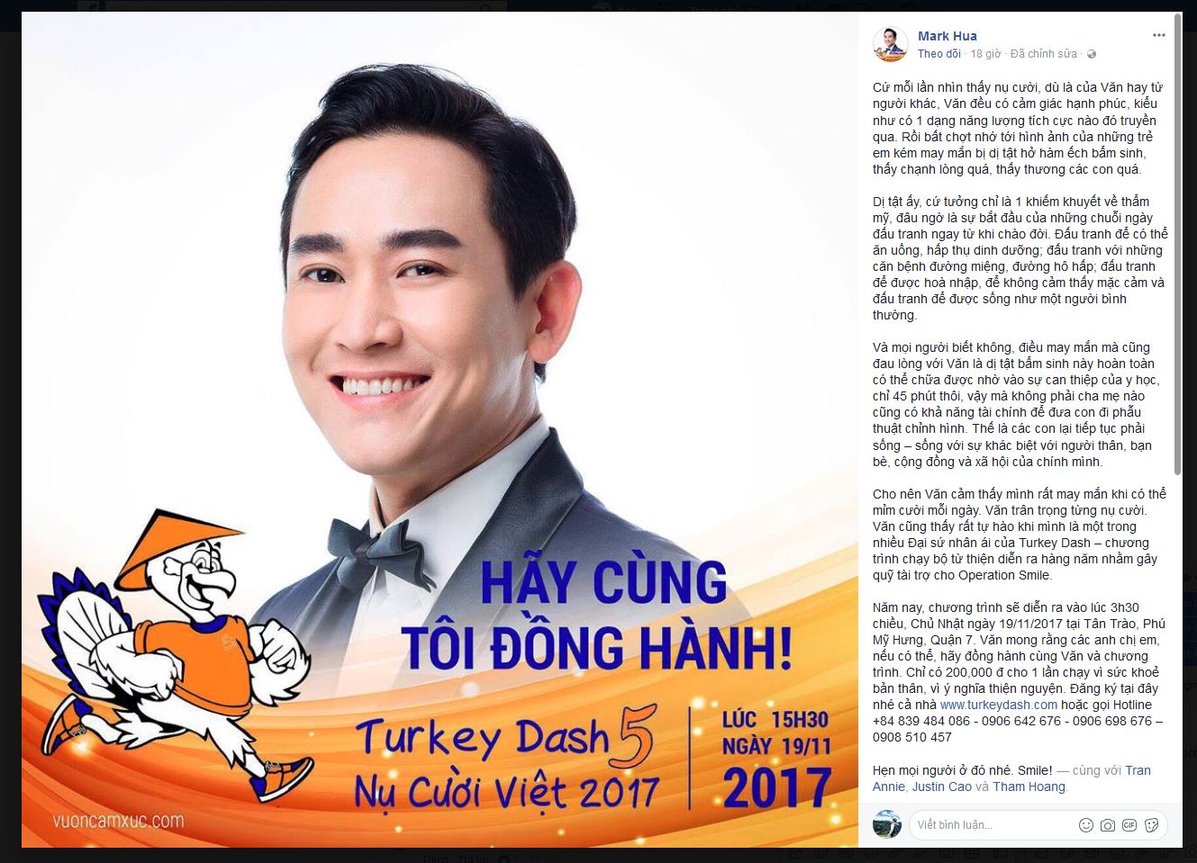 Cho nên Văn cảm thấy mình rất may mắn khi có thể mỉm cười mỗi ngày. Văn trân trọng từng nụ cười. Văn cũng thấy rất tự hào khi mình là một trong nhiều Đại sứ nhân ái của Turkey Dash – chương trình chạy bộ từ thiện diễn ra hàng năm nhằm gây quỹ tài trợ cho Operation Smile.”