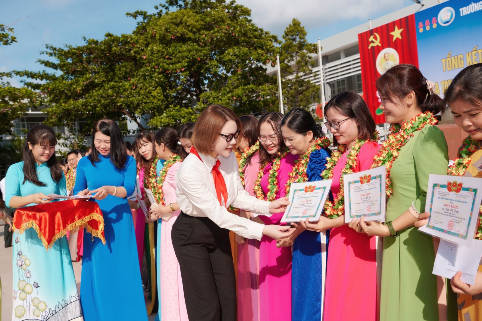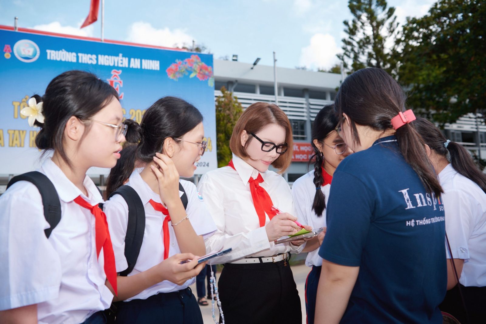Lý Nhã Kỳ mặc sơ mi trắng, đeo khăn quàng đỏ về thăm trường cũ