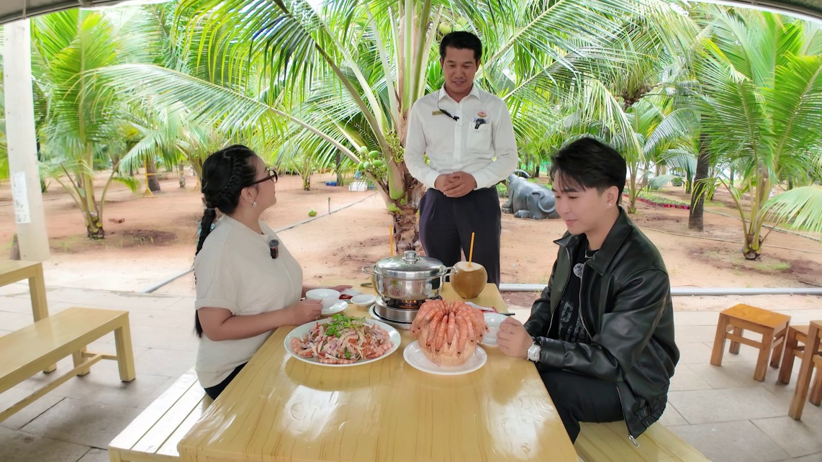 Sau khi khám phá “farm nho”, bộ đôi tiếp tục đến khu vực “farm dừa” để thưởng thức bữa tiệc cây nhà lá vườn. Trên chiếc bàn đặt giữa vườn dừa xanh rì, các món đặc sản được dọn ra: từ tôm hấp nước dừa, gỏi củ hủ dừa tôm thịt đến lẩu cù lao đậm đà hương vị miền Tây. Nguyên liệu đều được thu hoạch trực tiếp từ nông trại, mang đến trải nghiệm ẩm thực vừa tươi ngon vừa chân thật.