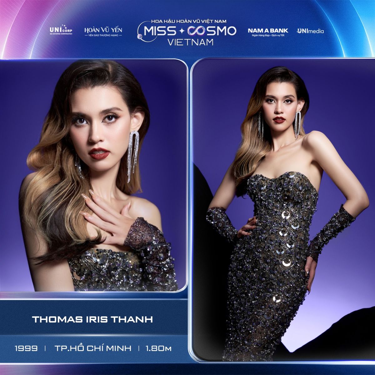 Thomas Iris Thanh - cô gái lai sở hữu chiều cao 1m8. Cô là con lai Đức - Việt có cha là người Đức, mẹ là người Việt Nam, Sinh năm 1999 tại Đức, sử dụng thành thạo 3 ngoại ngữ Việt - Đức - Anh. Trở về quê hương Việt Nam, hiện cô đang làm việc với vai trò hoạ sĩ vẽ tranh minh họa cho thiếu nhi tại TP.HCM. Trước khi đến với cuộc thi online Hoa hậu Hoàn vũ Việt Nam - Miss Cosmo Vietnam 2023, Thomas Iris Thanh từng đạt vị trí Top 2 Miss Charm Vietnam 2023.
