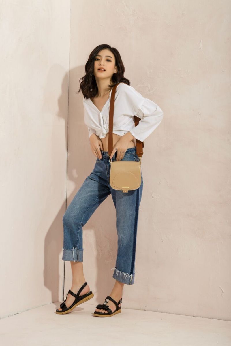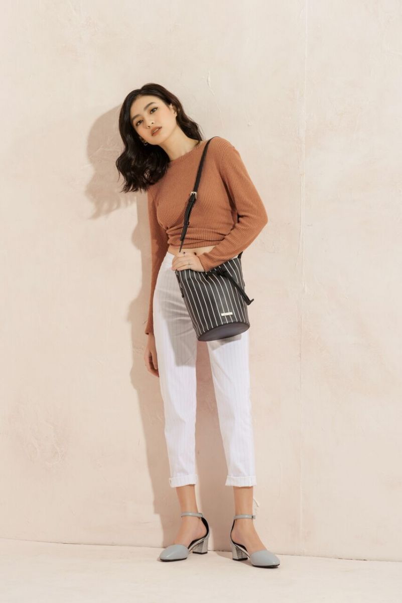 Trong ngày tháng 3 oi ả, những chiếc quần cao và chiếc áo thun ngắn sẽ là sự kết hợp thú vị. Nó không chỉ giúp cô nàng thuận tiện trong việc di chuyển mà còn tạo sự ấn tượng đối với người đối diện. Riêng với set đồ này, một chiếc túi xách bản to với điểm nhấn là khóa tròn ở giữa sẽ giúp các cô nàng hợp xu hướng hơn.