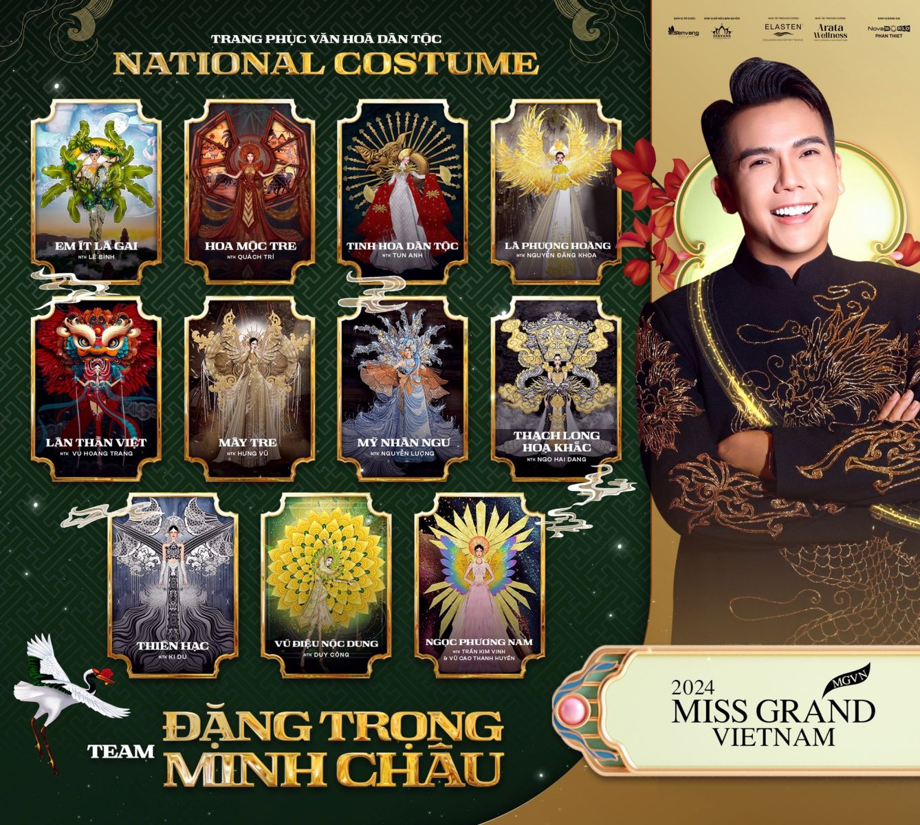 Theo thông tin công bố tại sự kiện họp báo, dàn thí sinh trình diễn trang phục dân tộc của team NTK Đặng Trọng Minh Châu gồm có Nguyễn Vĩnh Hà Phương, Nguyễn Thị Lệ Nam, Lâm Thị Thanh Tuyền, Dương Thị Hải My, Vũ Thị Kiều Trinh,… Ngoài ra hai nàng hậu gồm Nguyễn Lê Ngọc Thảo (Á hậu Việt Nam 2020) và Bùi Khánh Linh (Á hậu Miss Grand Vietnam 2023) cũng sẽ cùng Đặng Trọng Minh Châu và các học trò tạo nên những khoảnh khắc đáng nhớ trên sân khấu Miss Grand Vietnam 2024.