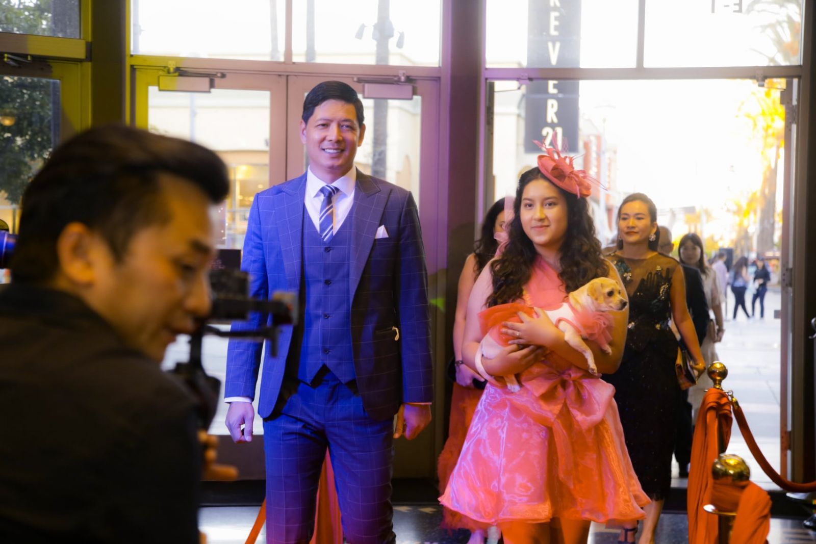 Diện cây hồng nổi bật trong ngày công chiếu phim tại Mỹ, “con gái cưng” của Bình Minh trong phim, Angelina Raja thu hút sự chú ý với vẻ ngoài ngày càng trưởng thành và xinh đẹp. Nữ diễn viên còn khiến các khách mời và khán giả không khỏi thích thú khi ôm cún cưng cũng “ăn diện” không kém lên thảm đỏ.