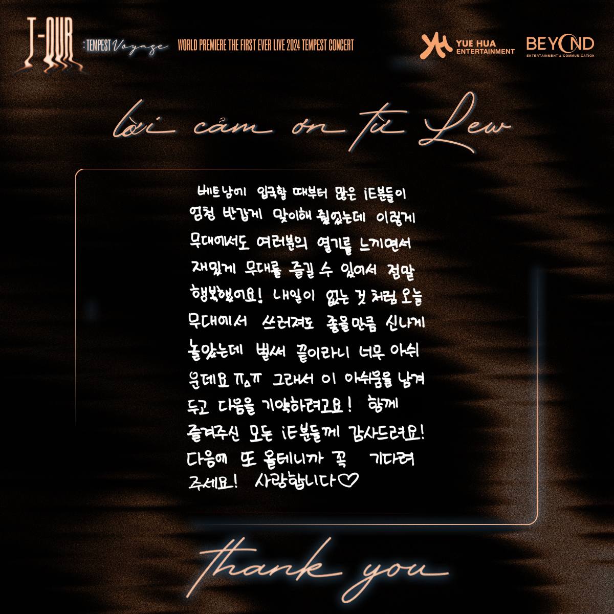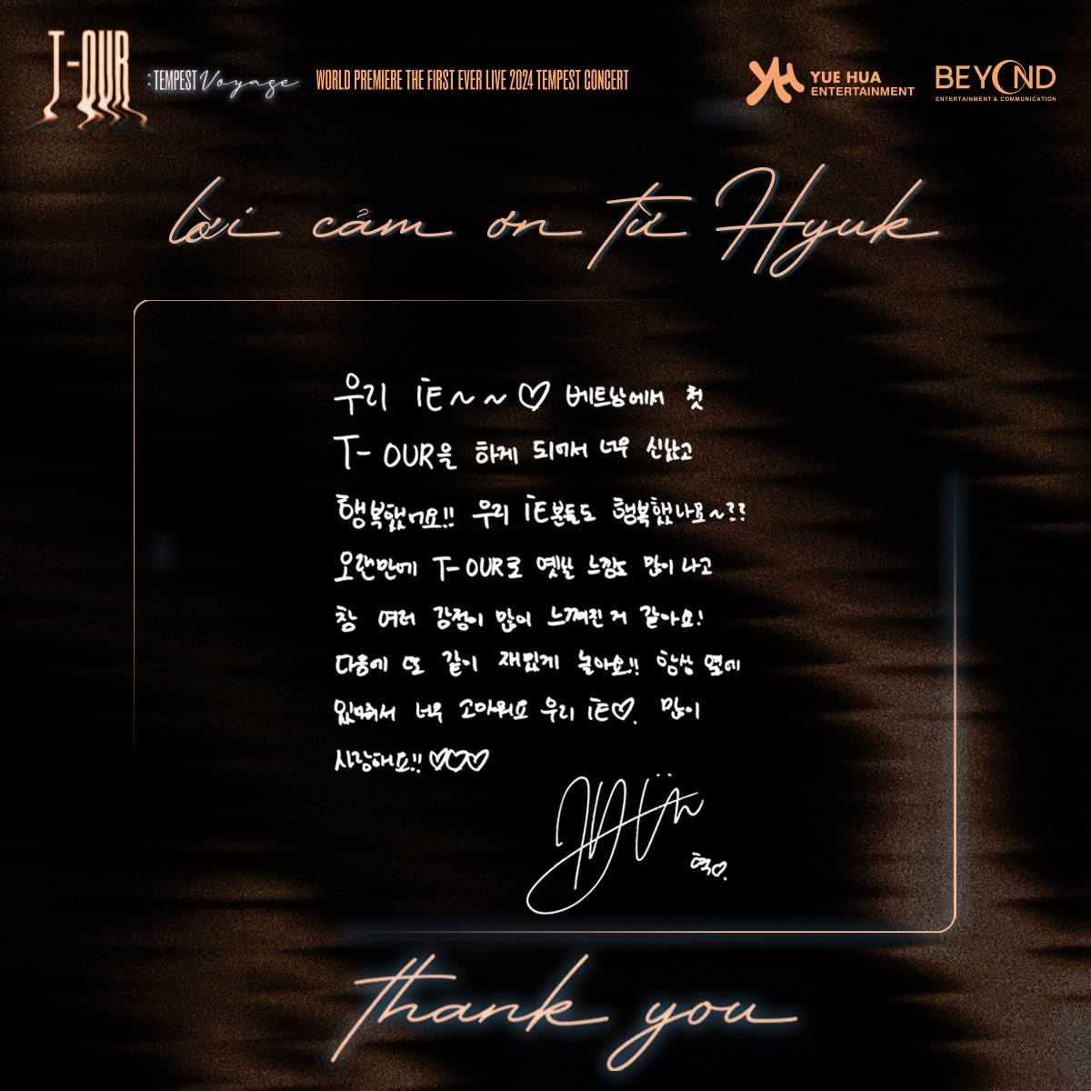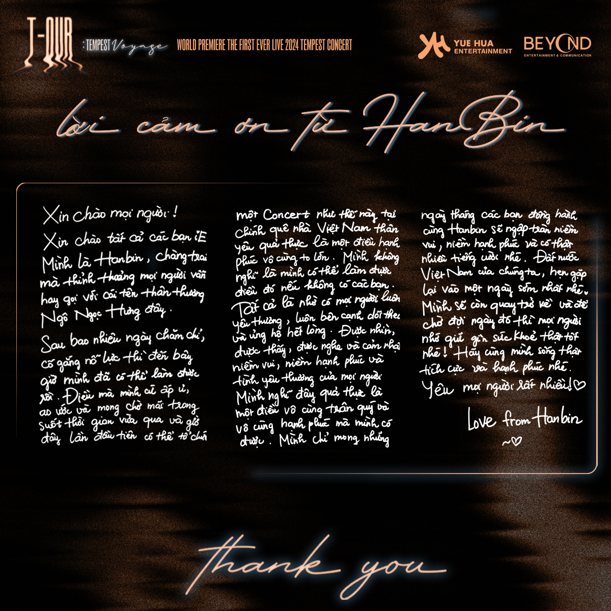 Hậu concert, mới đây, Hanbin và 5 thành viên còn lại của Tempest đã đăng tải thư viết tay gửi lời cảm ơn đến với khán giả Việt nói chung, cộng đồng V-iE (fan club của nhóm) nói riêng.