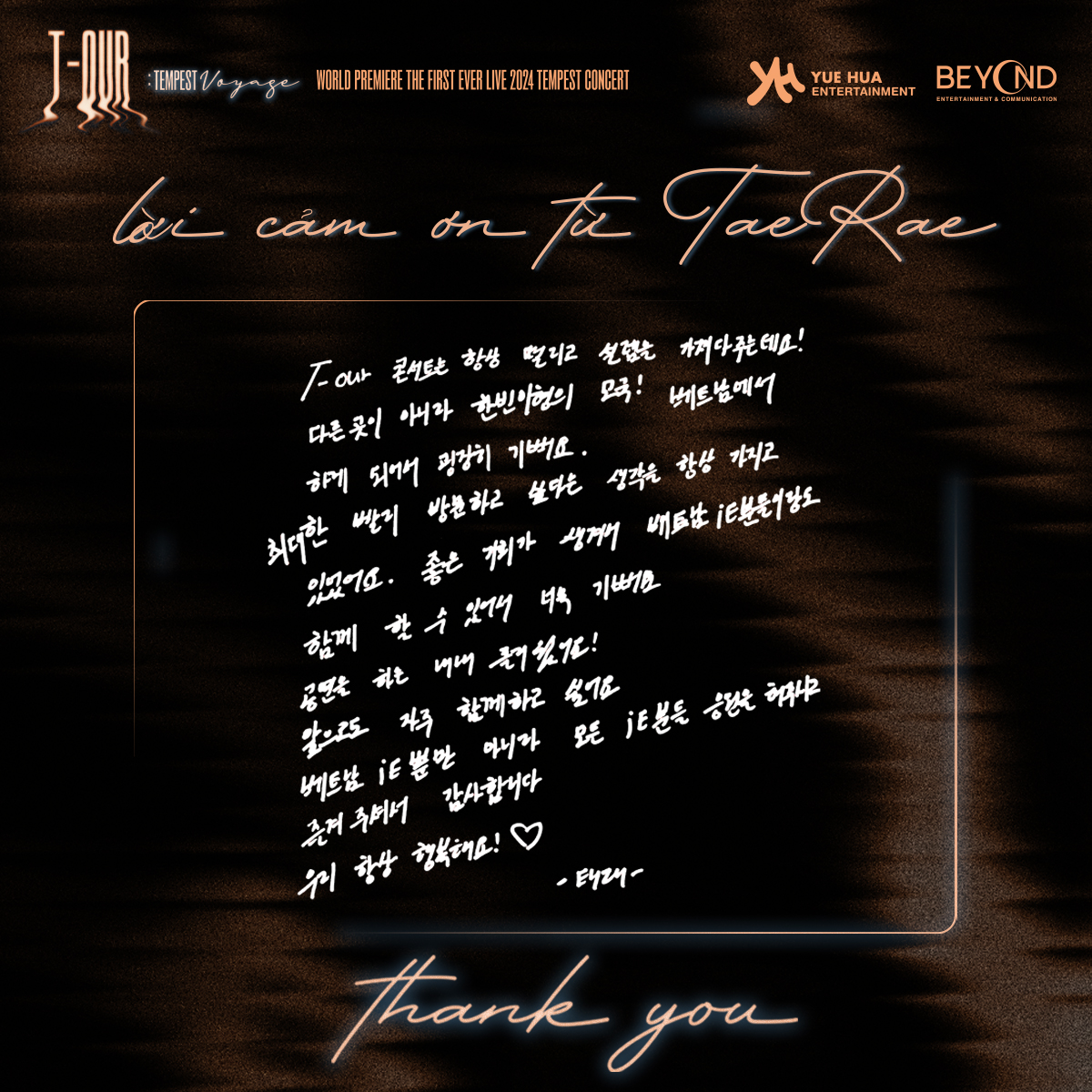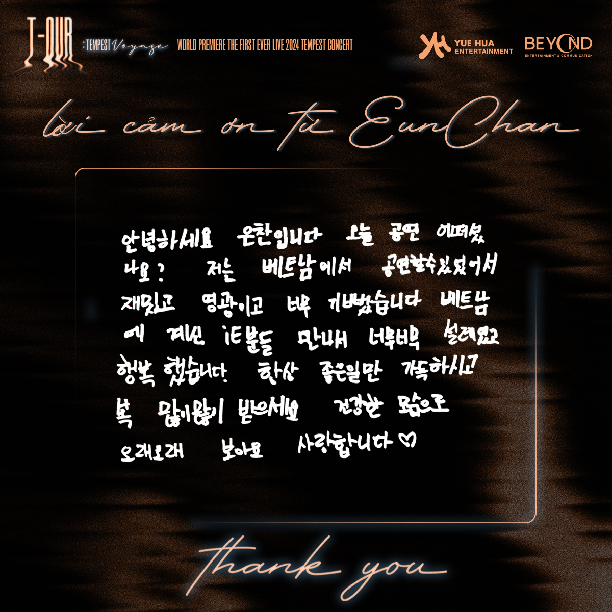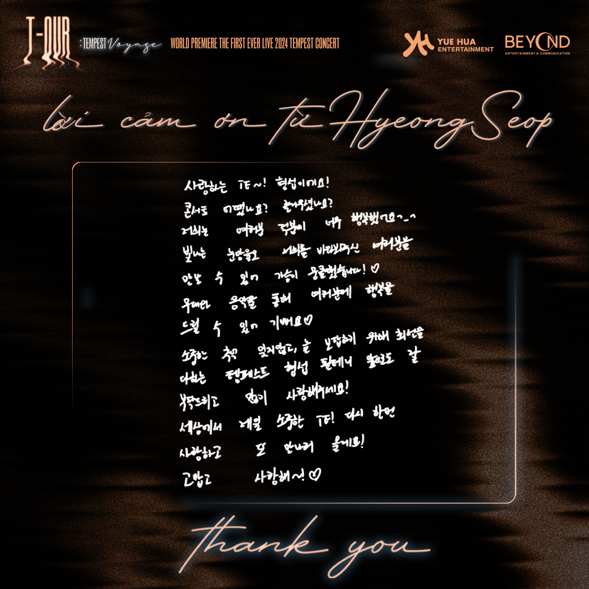 Hậu concert, mới đây, Hanbin và 5 thành viên còn lại của Tempest đã đăng tải thư viết tay gửi lời cảm ơn đến với khán giả Việt nói chung, cộng đồng V-iE (fan club của nhóm) nói riêng.