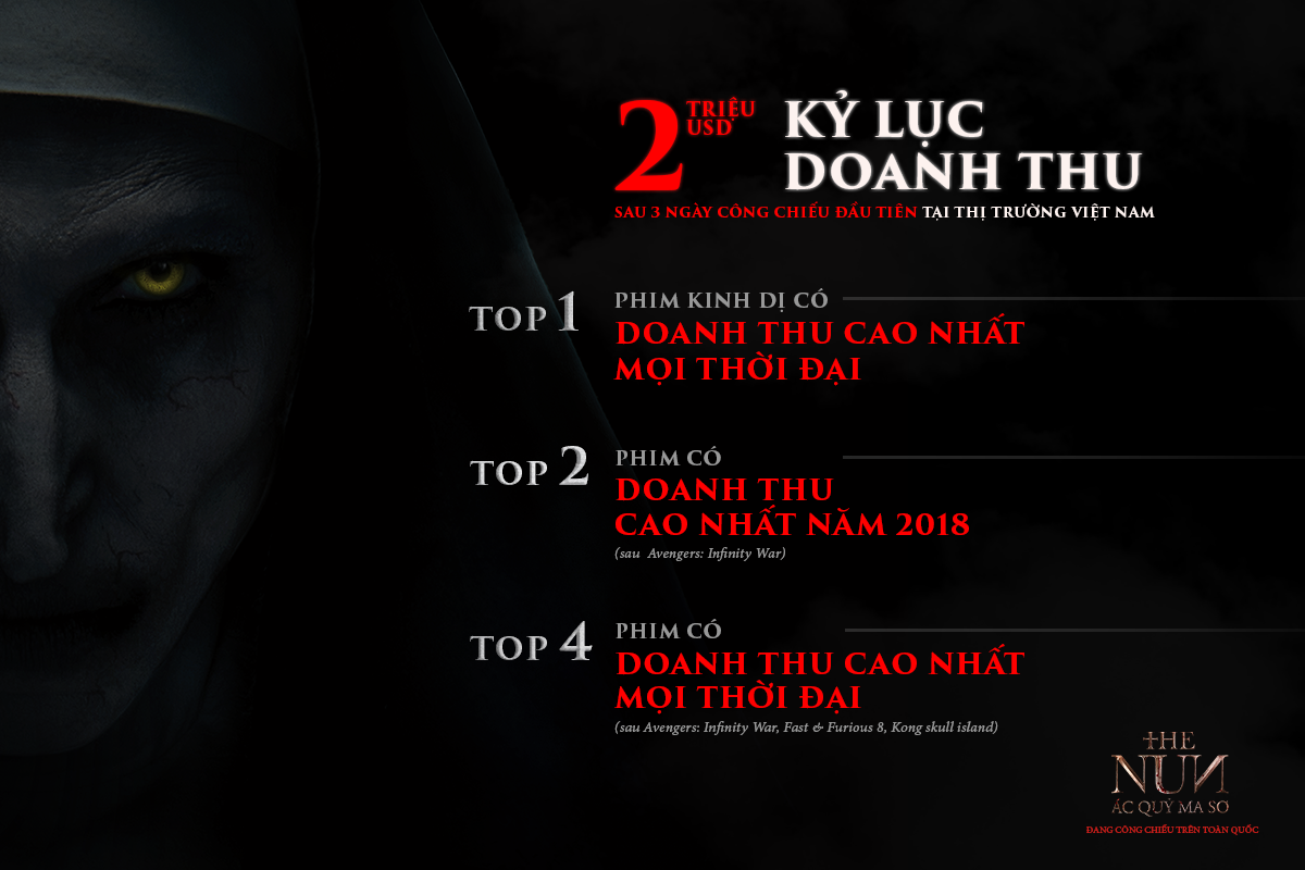 (ĐSVH) Ngay khi khởi chiếu, The Nun (tựa Việt hoá: Ác Quỷ Ma Sơ) đã thống lĩnh hoàn toàn đấu trường phòng vé, liên tiếp phá vỡ nhiều kỷ lục doanh thu và trở thành một trong những bộ phim kinh dị nhãn R thành công nhất mọi thời đại.