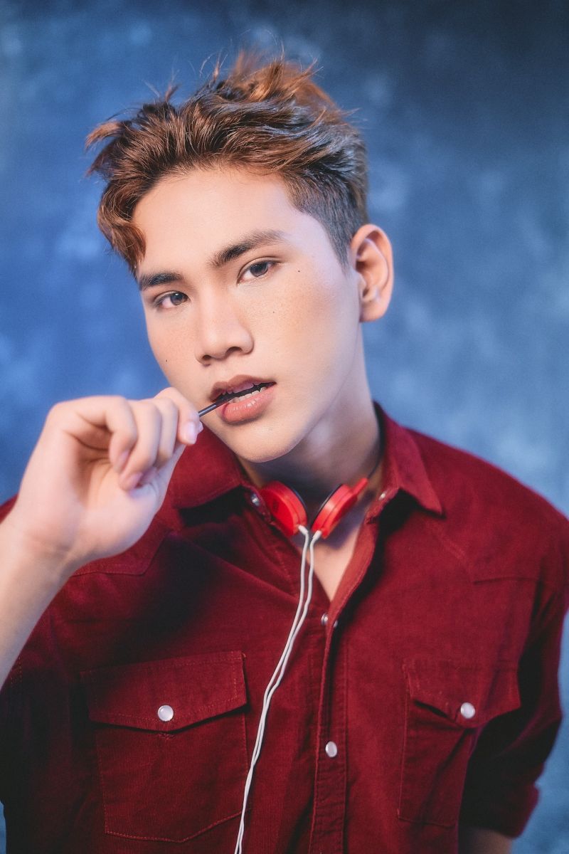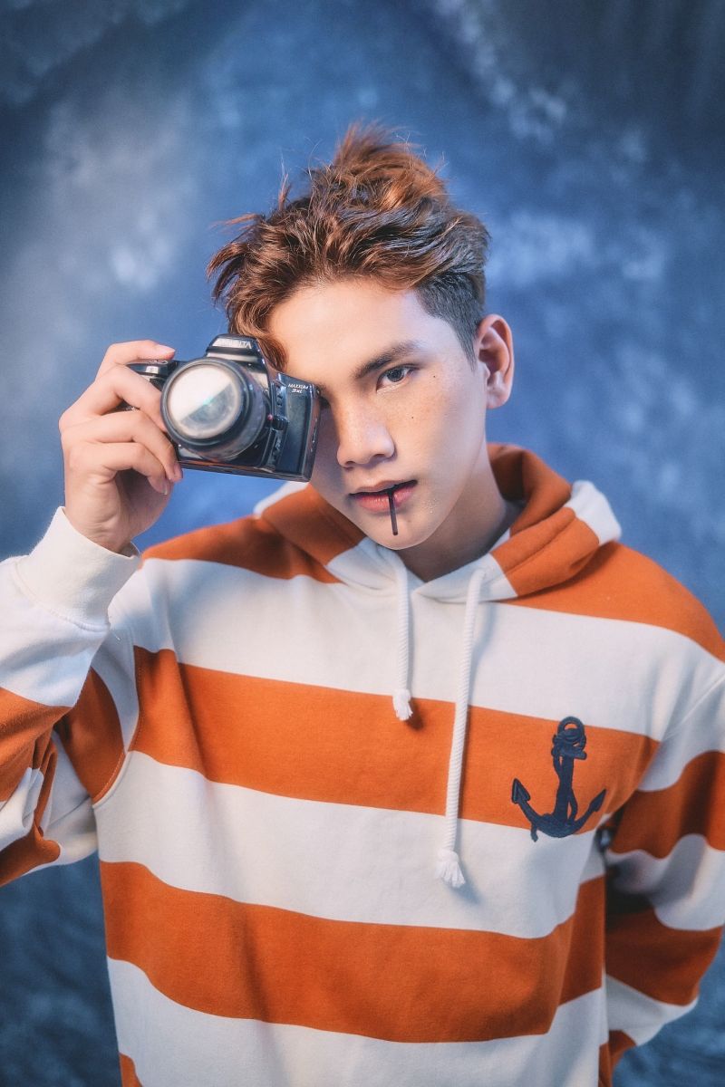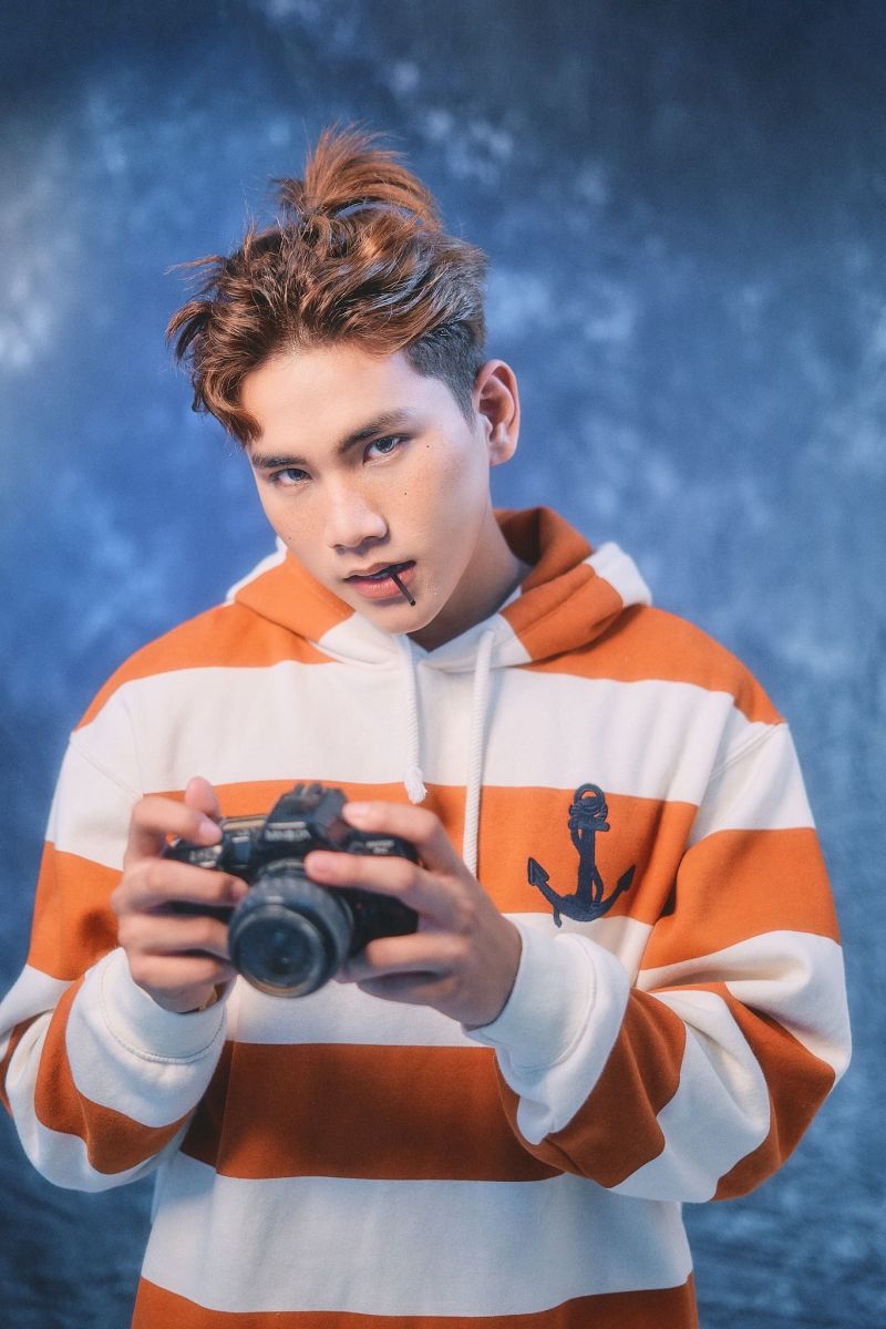 DV Thiện Nhân chọn cho mình áo sơ mi và áo hoodie màu cam sọc để bật lên sự sáng tạo mới đầy trẻ trung và yêu đời. Điểm nhấn là những chấm tàn nhang đơn giản để tạo điểm nhấn trên khuôn mặt nhưng không over.