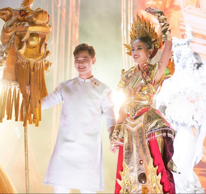 Trong đó, Á khôi Sông Vàm 2022 Nguyễn Thanh Thanh gây ấn tượng khi xuất hiện trong bộ trang phục mang tên “Lưỡng Nghê Chầu” của NTK Nguyễn Việt Hưng. Thiết kế lấy cảm hứng từ hình tượng Nghê - linh vật thuần Việt, tồn tại liên tục trong suốt dòng chảy văn hóa hàng nghìn năm của đất nước. Nghê xuất hiện trong nhiều không gian sống của người Việt, từ nhà dân đến cung điện, đình, chùa, lăng tẩm…