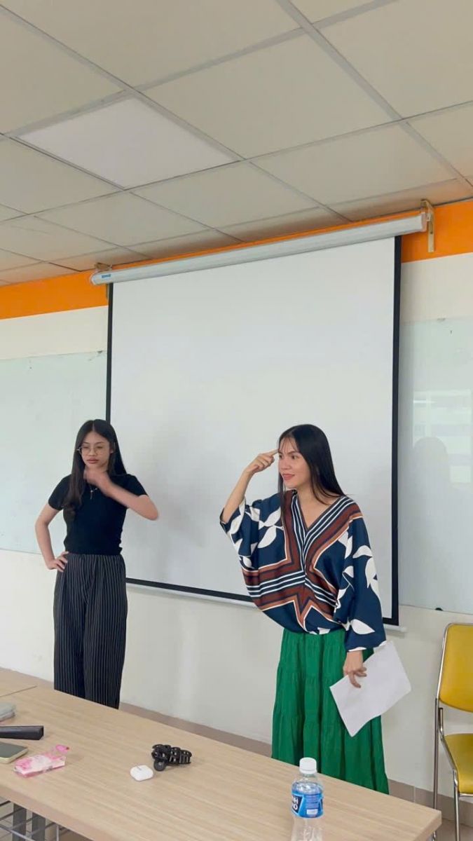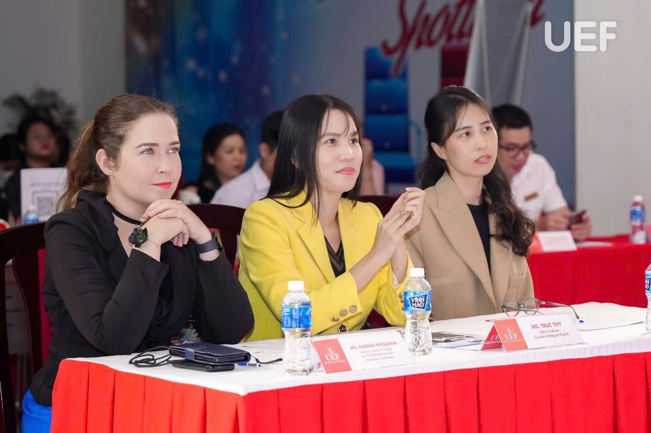 Chương trình sử dụng 100% ngôn ngữ tiếng Anh, giúp người học không chỉ luyện kỹ năng ngôn ngữ mà còn phát triển tư duy biểu cảm, sáng tạo – yếu tố quan trọng trong đào tạo ngành Ngôn ngữ hiện nay. Trúc Thy đảm nhiệm vai trò giám khảo chuyên môn, đánh giá phần trình diễn của từng nhóm sinh viên dựa trên cảm xúc, ngữ âm và khả năng hóa thân nhân vật.