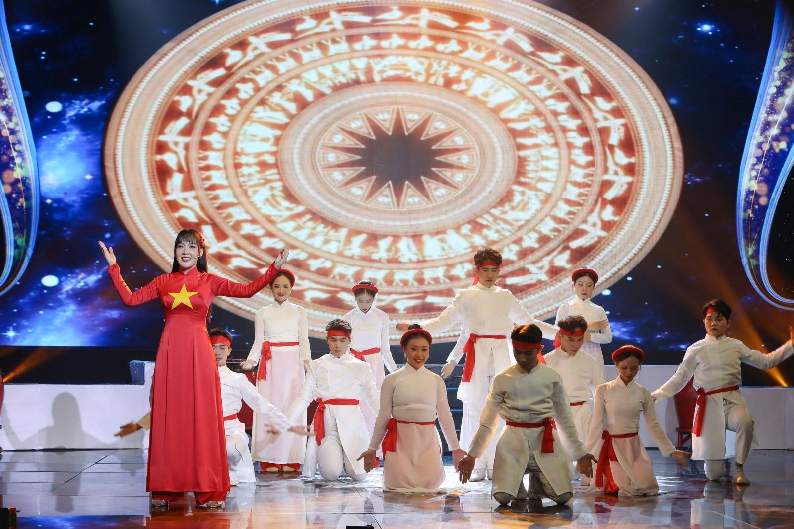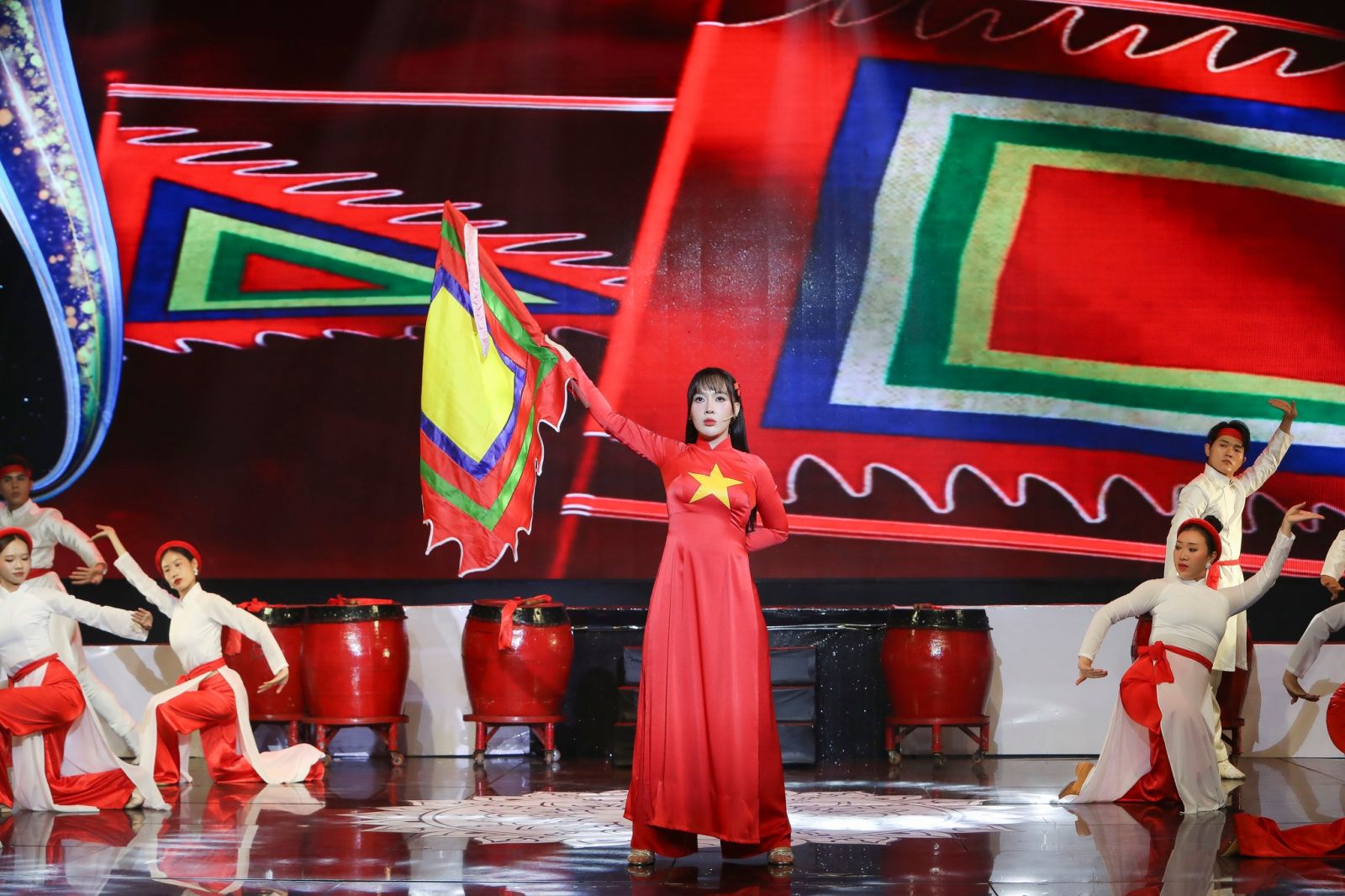 Không chỉ đơn thuần là một phần thi ca hát, Yến Khoa biến sân khấu thành một bản giao hưởng của âm nhạc, múa, ánh sáng và tinh thần dân tộc. Cô nàng khiến khán giả vỡ òa với những màn đánh trống dồn dập, múa cờ ngũ sắc và đặc biệt là phần múa rồng đầy khí thế. Dưới tiếng trống hào hùng, từng câu hát cất lên như lời khẳng định mạnh mẽ về niềm tự hào dân tộc.